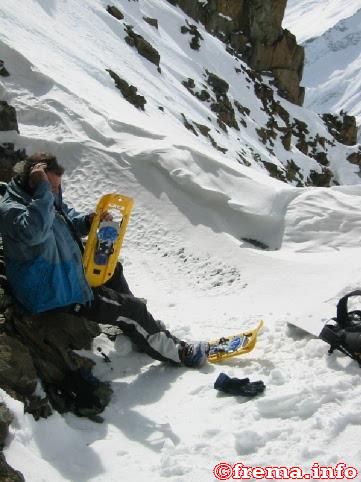 Lawinen - Verschütteten - Suchgerät LVS, Klettergurt mit Bandschlinge, Lawinenschaufel und Skistöcke (Snowboarder) – diese „Tools“ werden, wenn nicht bereits aus persönlichem Besitz mitgebracht und funktionstüchtig, vor Ort vom Bergführer vermietet. |